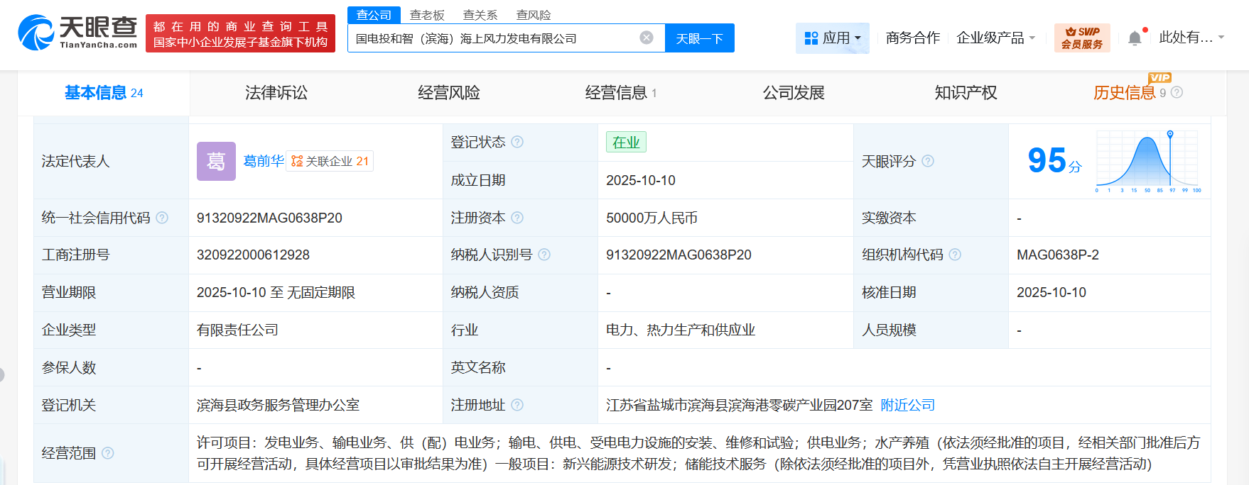 天眼查工商信息显示,近日,国电投和智(滨海)海上风力发电有限公司成立,法定代表人为葛前华,注册资本5亿人民币,经营范围含发电业务、输电业务、供(配)电业务,输电、供电、受电电力设施的安装、维修和试验,供电业务,水产养殖等。股东信息显示,该公司由国家电投集团江苏电力有限公司、新力时代能源科技有限公司、江苏苏盐阀门机械有限公司等共同持股。