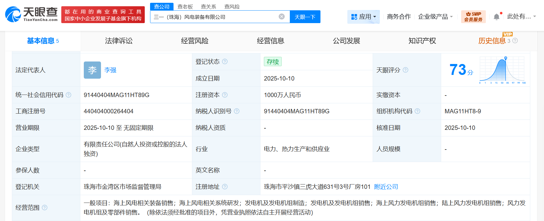 天眼查工商信息显示,近日,三一(珠海)风电装备有限公司成立,法定代表人为李强,注册资本1000万人民币,经营范围为海上风电相关装备销售、海上风电相关系统研发、发电机及发电机组制造、发电机及发电机组销售、海上风力发电机组销售、陆上风力发电机组销售、风力发电机组及零部件销售。股东信息显示,该公司由三一重能(688349)全资持股。