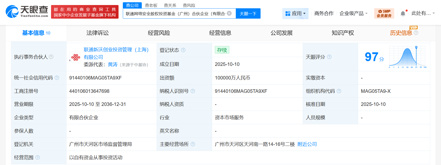 天眼查app显示,近日,联通网络安全股权投资基金(广州)合伙企业(有限合伙)成立,执行事务合伙人为联通新沃创业投资管理(上海)有限公司,出资额10亿人民币,经营范围为以自有资金从事投资活动。合伙人信息显示,该基金由中国联通旗下联通战新私募股权投资基金(武汉)合伙企业(有限合伙)、联通创新创业投资有限公司、联通新沃创业投资管理(上海)有限公司及上海国泰君安创新股权投资母基金中心(有限合伙)等共同出资。