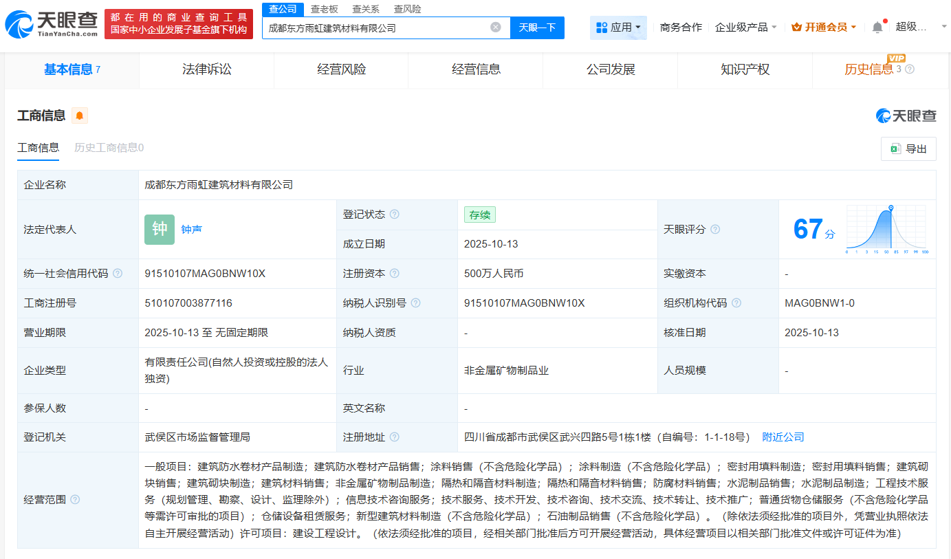 天眼查app显示,近日,成都东方雨虹建筑材料有限公司成立,法定代表人为钟声,注册资本500万人民币,经营范围包括建筑防水卷材产品制造、建筑防水卷材产品销售、涂料销售、建筑砌块制造等。股东信息显示,该公司由东方雨虹(002271)全资持股。