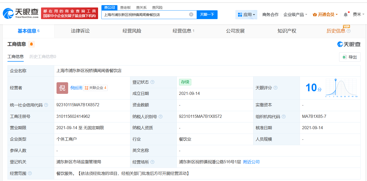 天眼查app显示,涉事的上海市浦东新区祝桥镇闻闻香餐饮店成立于2021年9月,为个体工商户,经营者为倪某某,经营范围为餐饮服务。