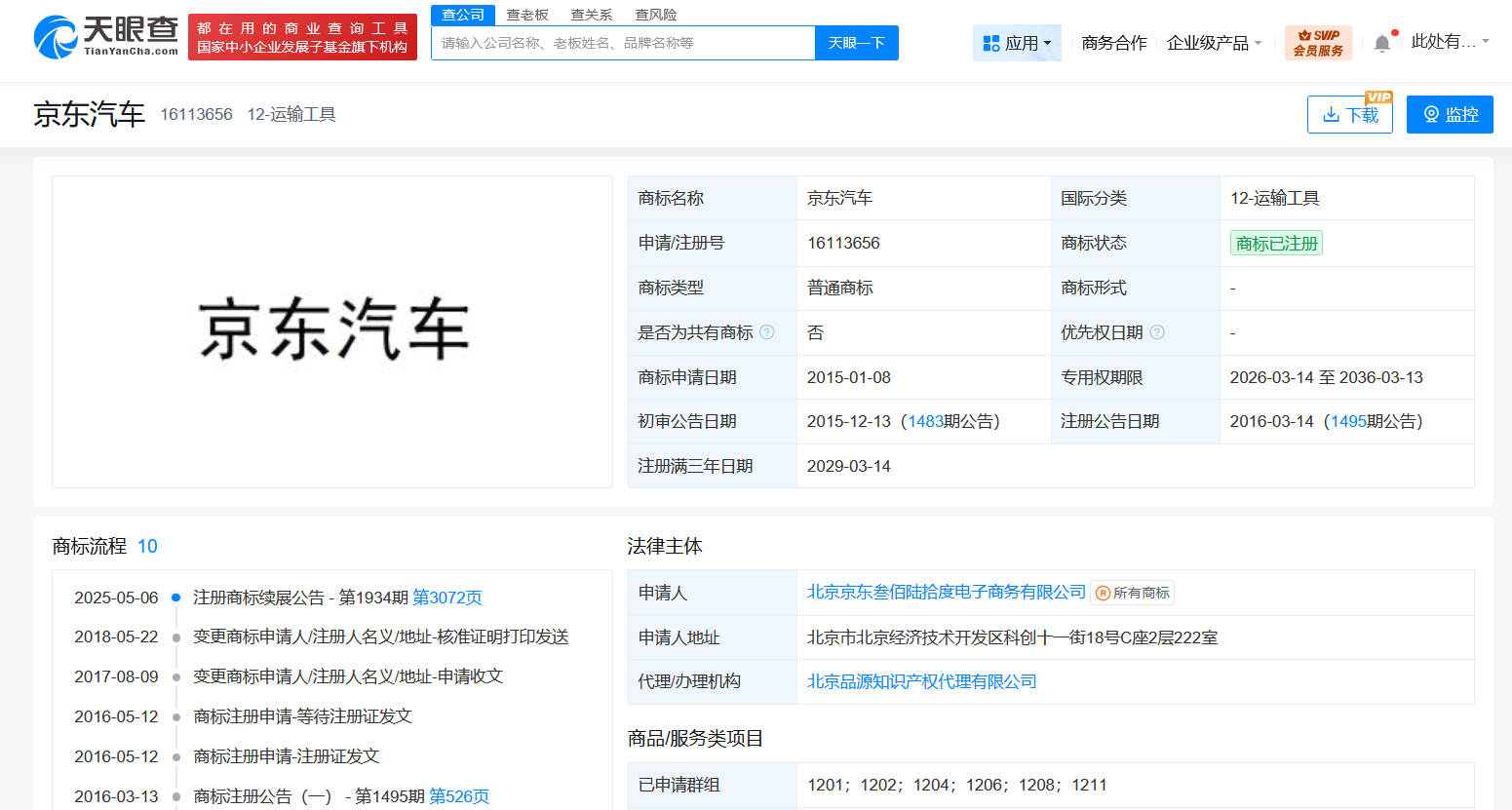 天眼查app显示,北京京东叁佰陆拾度电子商务有限公司已申请注册多枚“京东汽车”“京东汽车 jd auto”“京东汽车 car.jd.com”商标,国际分类为运输工具、科学仪器、广告销售等,当前部分商标已注册成功。