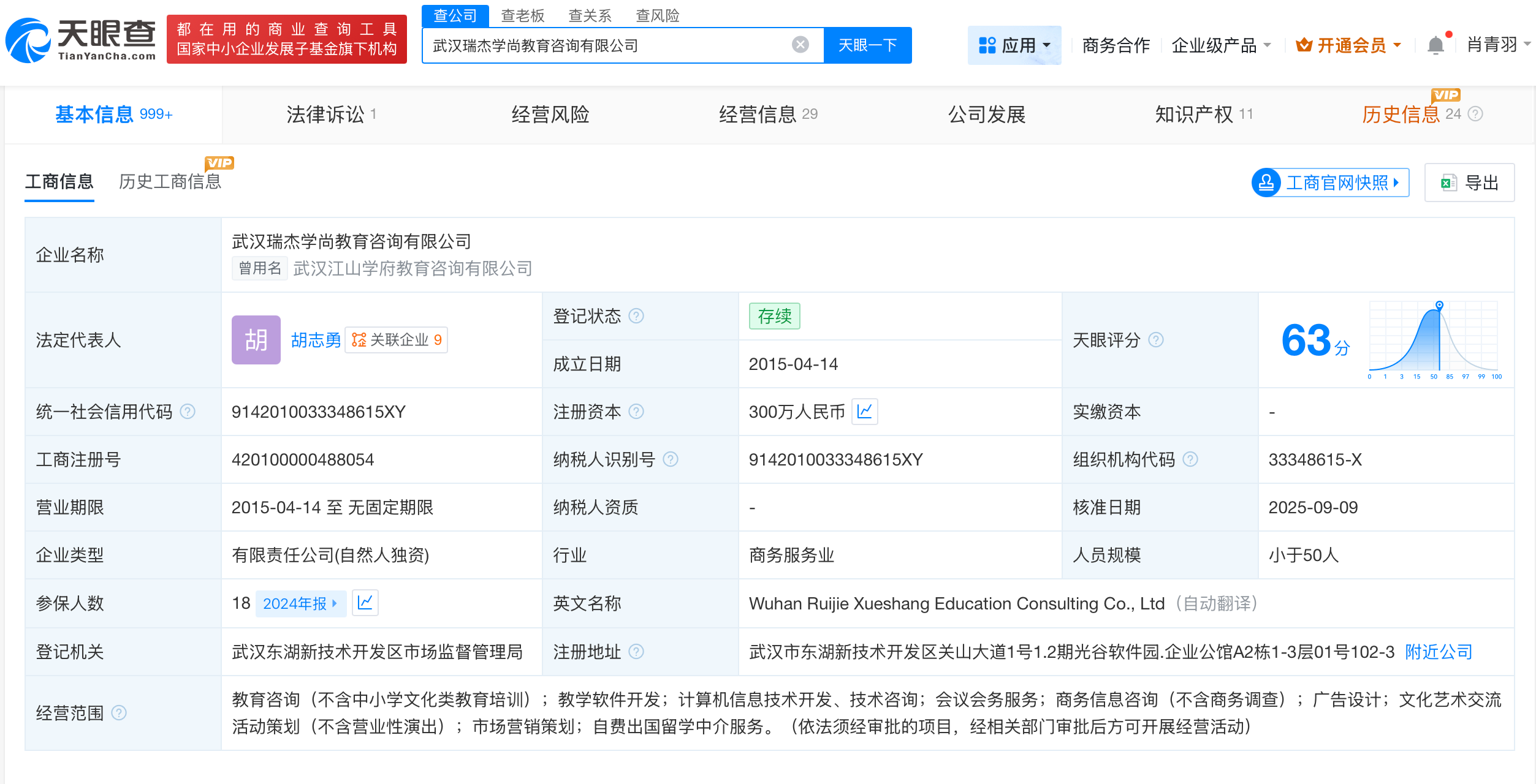 天眼查app显示,武汉瑞杰学尚教育咨询有限公司成立于2015年4月,法定代表人为胡志勇,注册资本300万人民币,经营范围包括教育咨询、教学软件开发等,由高小霞全资持股。天眼查知识产权信息显示,该公司已成功注册1枚“精英人才 elite talents”商标。