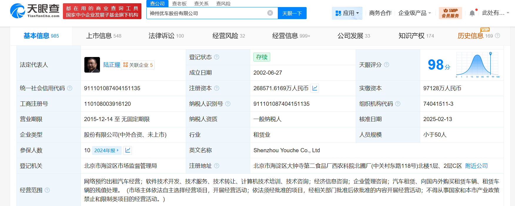 神州优车股份有限公司成立于2002年6月,法定代表人为陆正耀,注册资本约26.86亿人民币,经营范围含网络预约出租汽车经营,软件技术开发、技术服务、技术转让、计算机技术培训、技术咨询,经济信息咨询,企业管理咨询等。股东信息显示,该公司由陆正耀、star vantage (china) limited等共同持股。天眼风险信息显示,该公司现存4条被执行人信息,被执行总金额超24亿元,此外,该公司还存在多条终本案件及股权冻结信息。