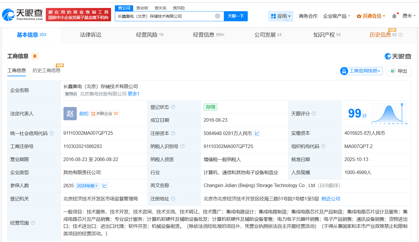 该公司成立于2016年8月,法定代表人为赵纶,经营范围包括集成电路设计、集成电路制造、集成电路芯片及产品制造等,现由长鑫科技集团股份有限公司、国家集成电路产业投资基金二期股份有限公司、北京亦庄国际投资发展有限公司及上述新增股东共同持股。