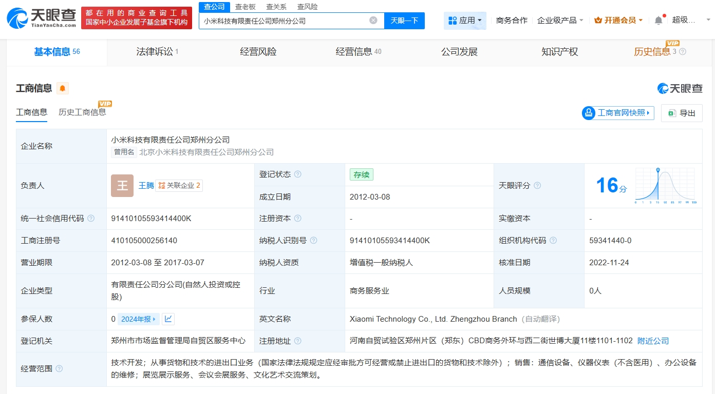天眼查app显示,近日,小米之家商业有限公司郑州第九分公司发生工商变更,王腾卸任该公司负责人,由程光接任。目前,王腾名下还关联1家小米科技有限责任公司郑州分公司。