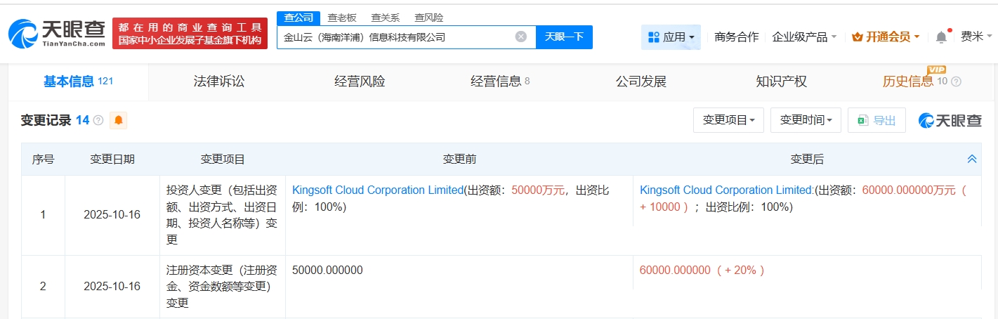 天眼查app显示,近日,金山云(海南洋浦)信息科技有限公司发生工商变更,注册资本由5亿美元增至6亿美元,增幅20%。