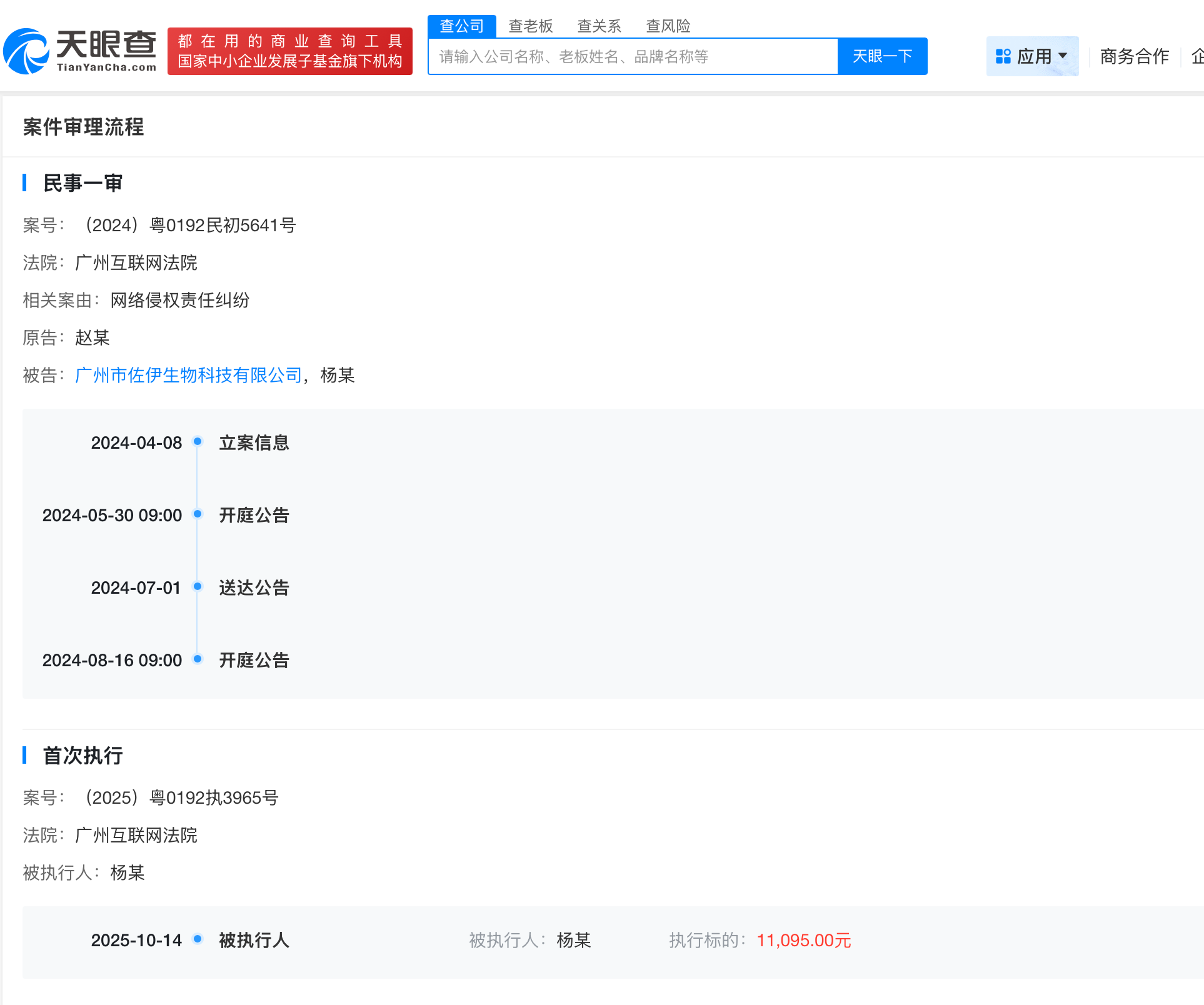 天眼查天眼风险信息显示,近日,杨某某新增一则被执行人信息,执行标的1.1万余元,涉及与赵丽颖相关网络侵权责任纠纷案件,执行法院为广州互联网法院。