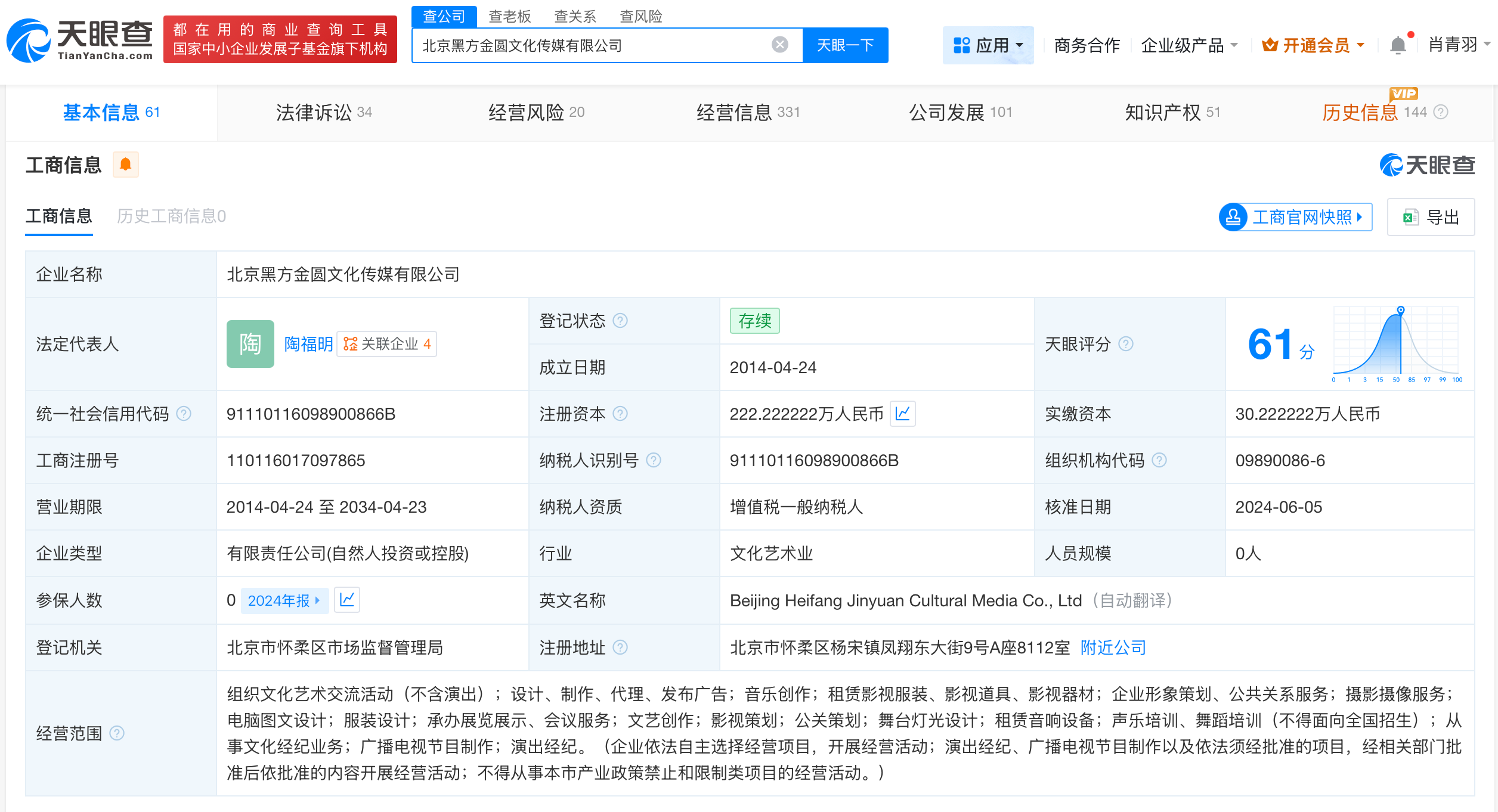 天眼查天眼风险信息显示,近日,尚雯婕新增一则股权冻结信息,股权所在企业为北京黑方金圆文化传媒有限公司,冻结股权数额约93.78万人民币,冻结期限自2025年9月9日至2028年9月8日,执行法院为北京市朝阳区人民法院。