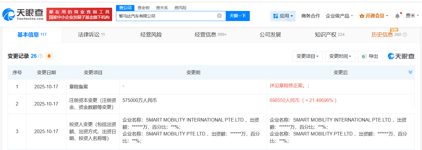 天眼查app显示,近日,智马达汽车有限公司发生工商变更,注册资本由57.5亿人民币增至约69.9亿人民币,增幅约21%。