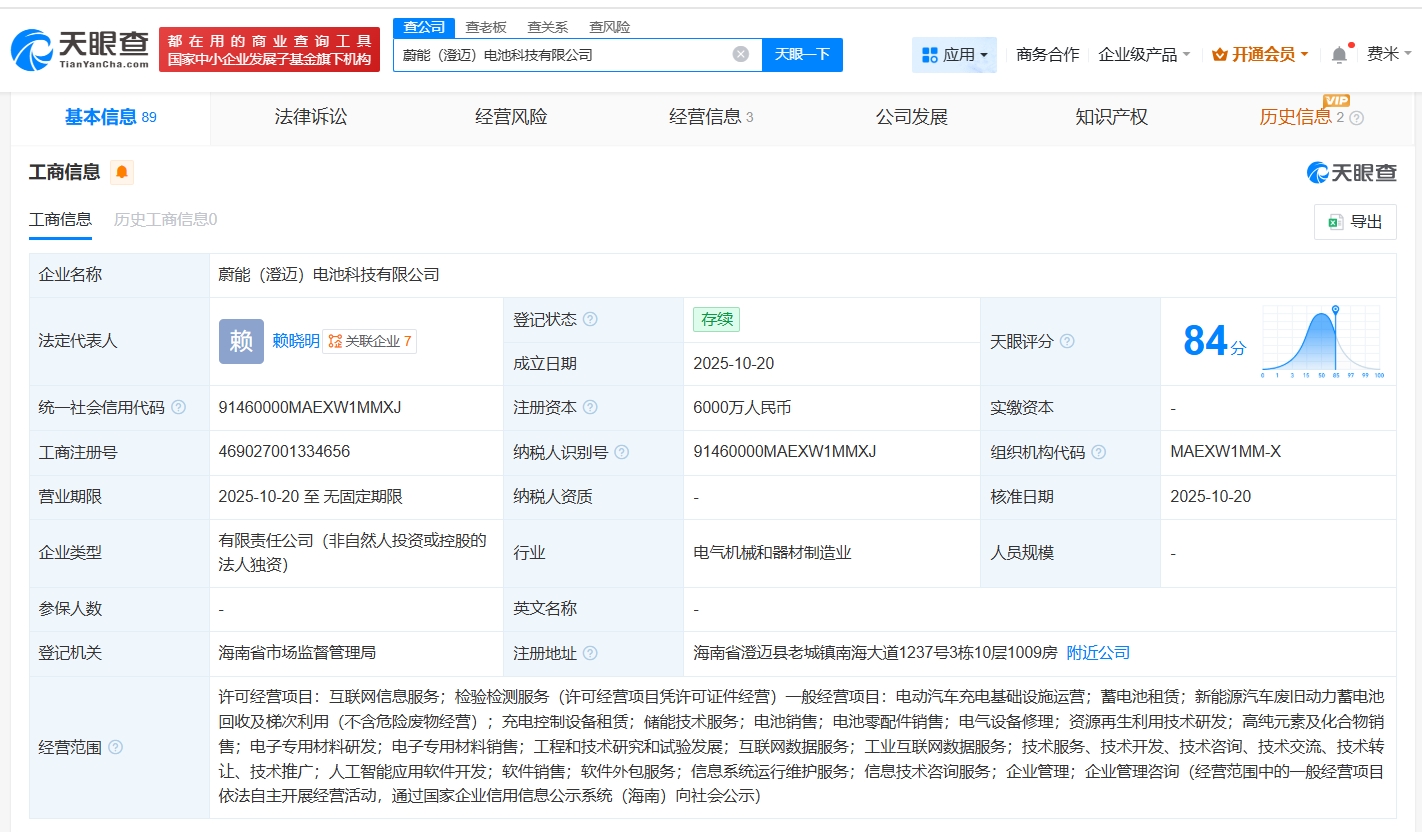 天眼查app显示,近日,蔚能(澄迈)电池科技有限公司成立,法定代表人为赖晓明,注册资本6000万人民币,经营范围包括电动汽车充电基础设施运营、蓄电池租赁、新能源汽车废旧动力蓄电池回收及梯次利用等。股东信息显示,该公司由武汉蔚能电池资产有限公司全资持股。