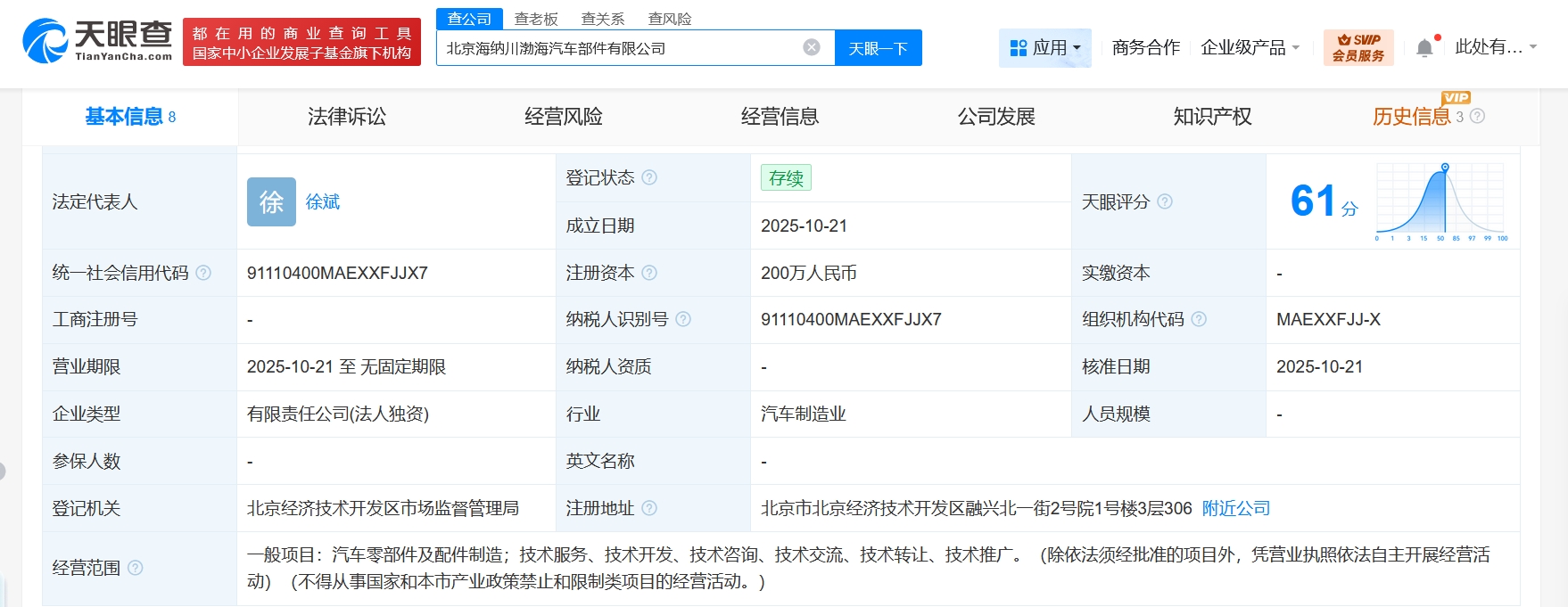天眼查工商信息显示,近日,北京海纳川渤海汽车部件有限公司成立,法定代表人为徐斌,注册资本200万人民币,经营范围为汽车零部件及配件制造,技术服务、技术开发、技术咨询、技术交流、技术转让、技术推广。股东信息显示,该公司由北汽集团旗下北京海纳川汽车部件股份有限公司全资持股。