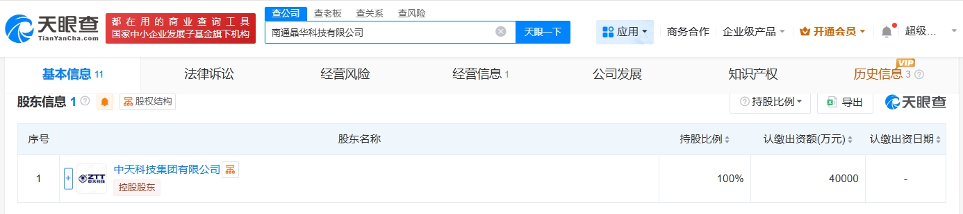 天眼查app显示,近日,南通晶华科技有限公司成立,法定代表人为曹珊珊,注册资本4亿人民币,经营范围包括光学玻璃制造、光学玻璃销售、功能玻璃和新型光学材料销售等。股东信息显示,该公司由中天科技集团有限公司全资持股。