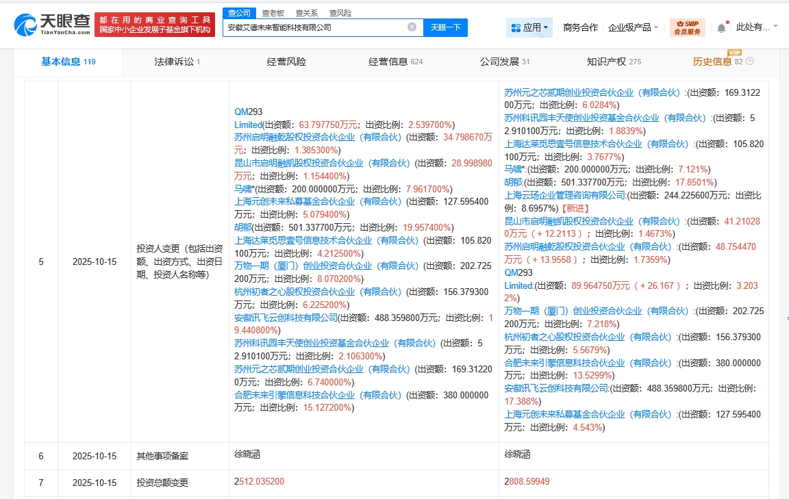 安徽艾德未来智能科技有限公司成立于2021年7月,法定代表人为马啸,经营范围含智能机器人的研发、计算机软硬件及外围设备制造、计算机系统服务、软件开发、软件销售、电子产品销售、通讯设备销售、企业管理、企业管理咨询等。股东信息显示,该公司现由胡郁、安徽讯飞云创科技有限公司、合肥未来引擎信息科技合伙企业(有限合伙)及上述新增股东等共同持股。