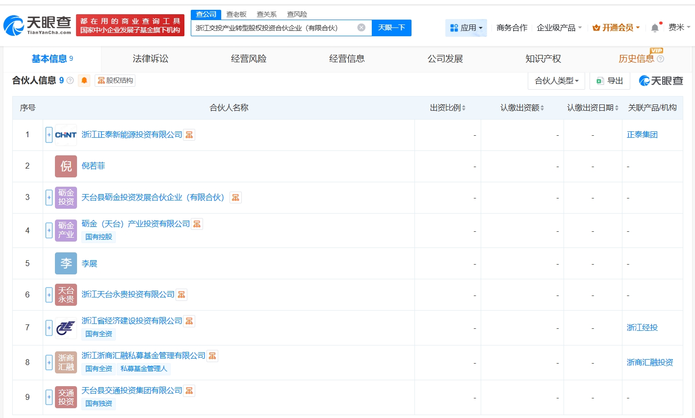 天眼查app显示,近日,浙江交投产业转型股权投资合伙企业(有限合伙)成立,执行事务合伙人为倪若菲,出资额9.95亿人民币,经营范围为股权投资,由浙江正泰新能源投资有限公司、天台县砺金投资发展合伙企业(有限合伙)、浙江天台永贵投资有限公司等共同出资。