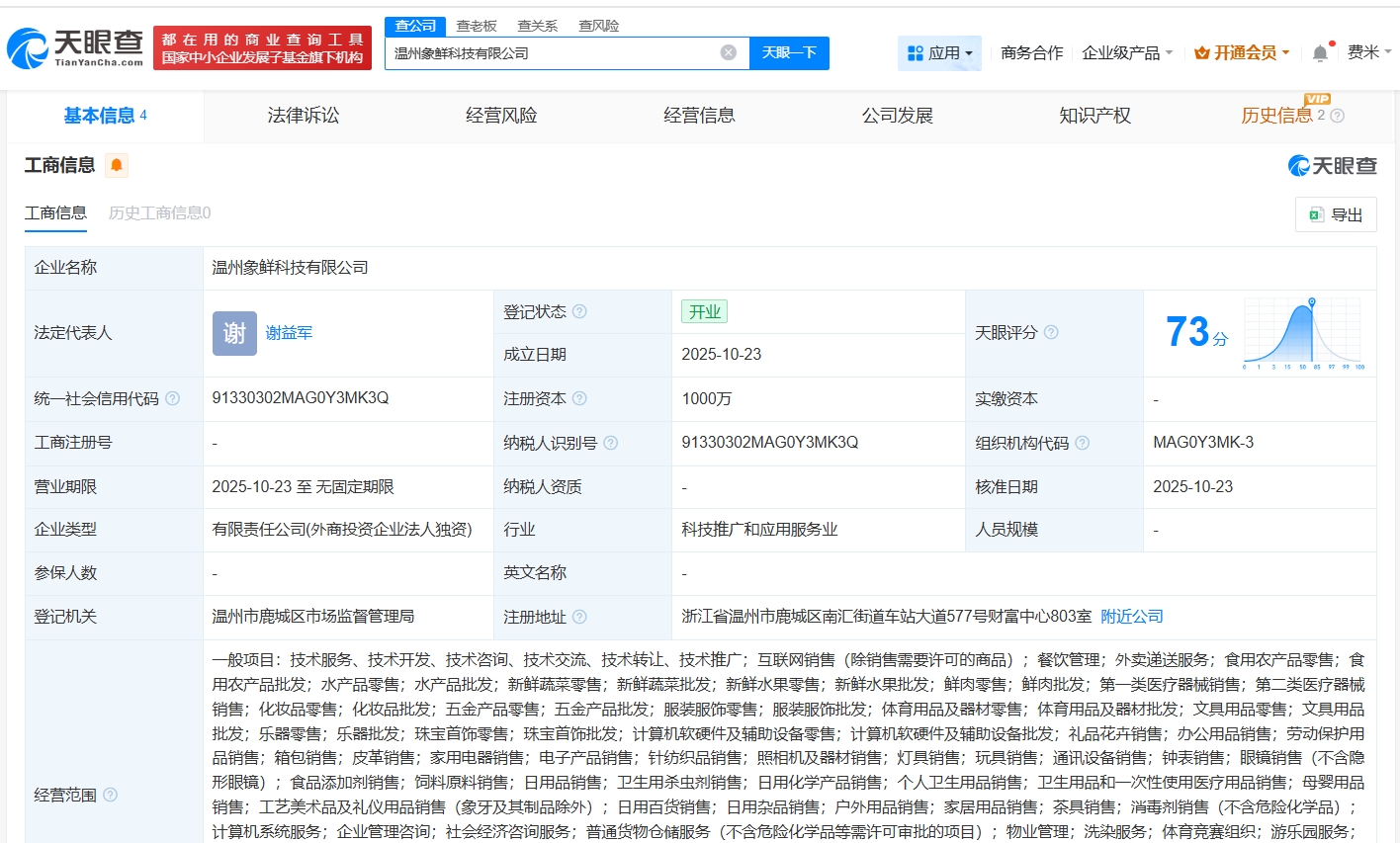 天眼查app显示,10月23日,温州象鲜科技有限公司成立,法定代表人为谢益军,注册资本1000万人民币,经营范围包括互联网销售、餐饮管理、外卖递送服务等,由小象超市关联公司北京象鲜科技有限公司全资持股。