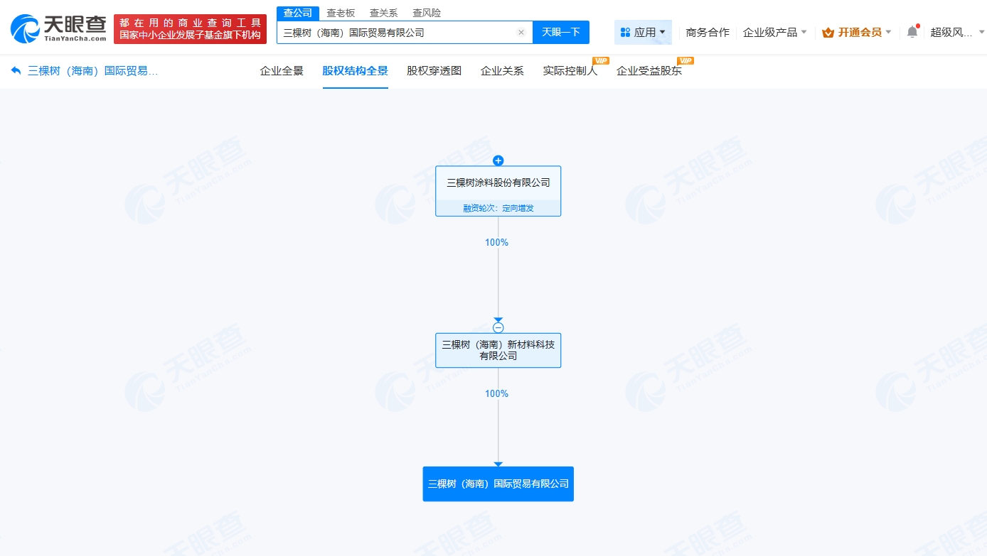 天眼查app显示,近日,三棵树(海南)国际贸易有限公司成立,法定代表人为洪圣源,注册资本5000万人民币,经营范围包括国内贸易代理、表面功能材料销售、贸易经纪等。股权全景穿透图显示,该公司由三棵树(603737)间接全资持股。