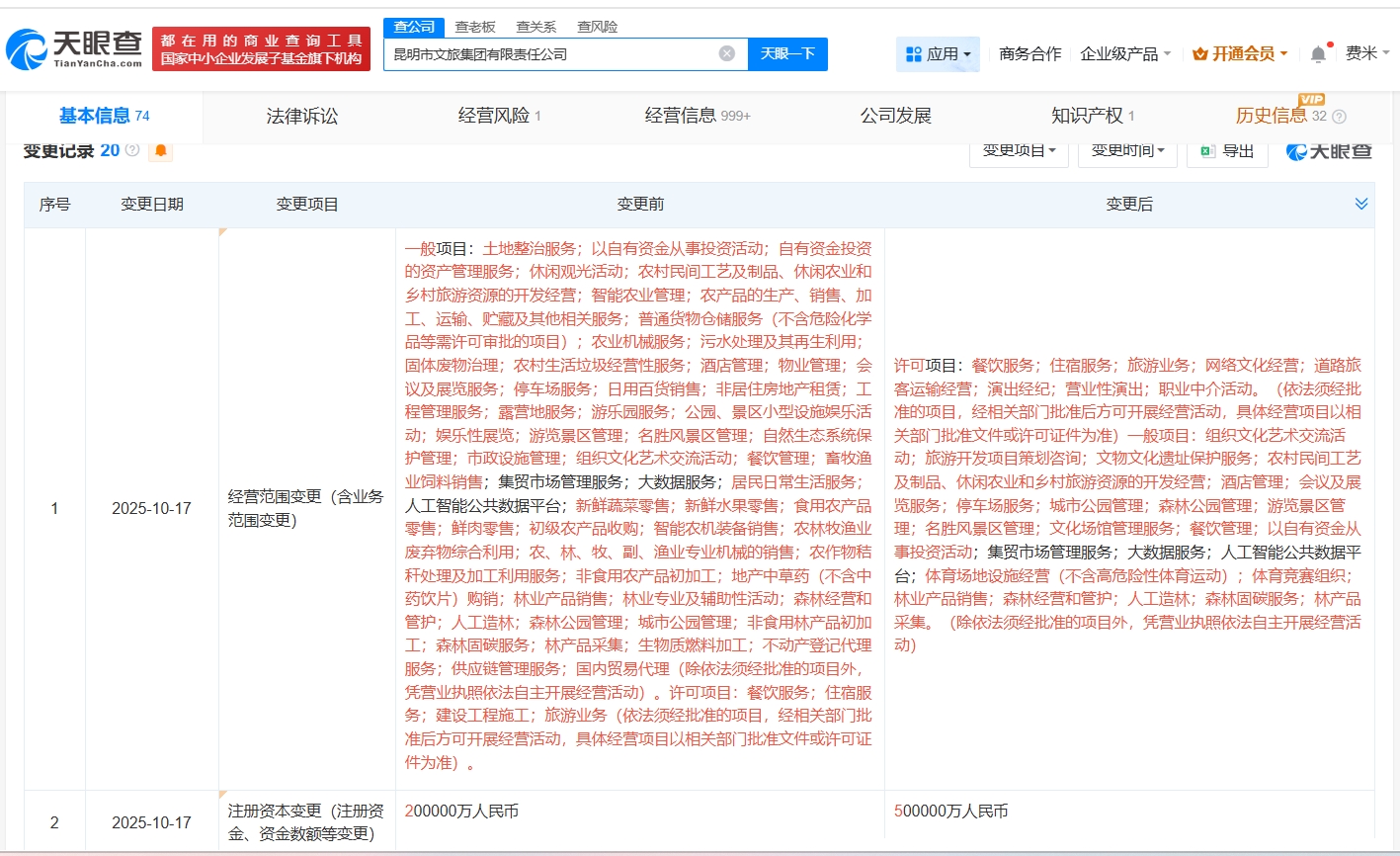 天眼查app显示,近日,昆明市文旅集团有限责任公司发生工商变更,注册资本由20亿人民币增至50亿人民币,增幅150%。