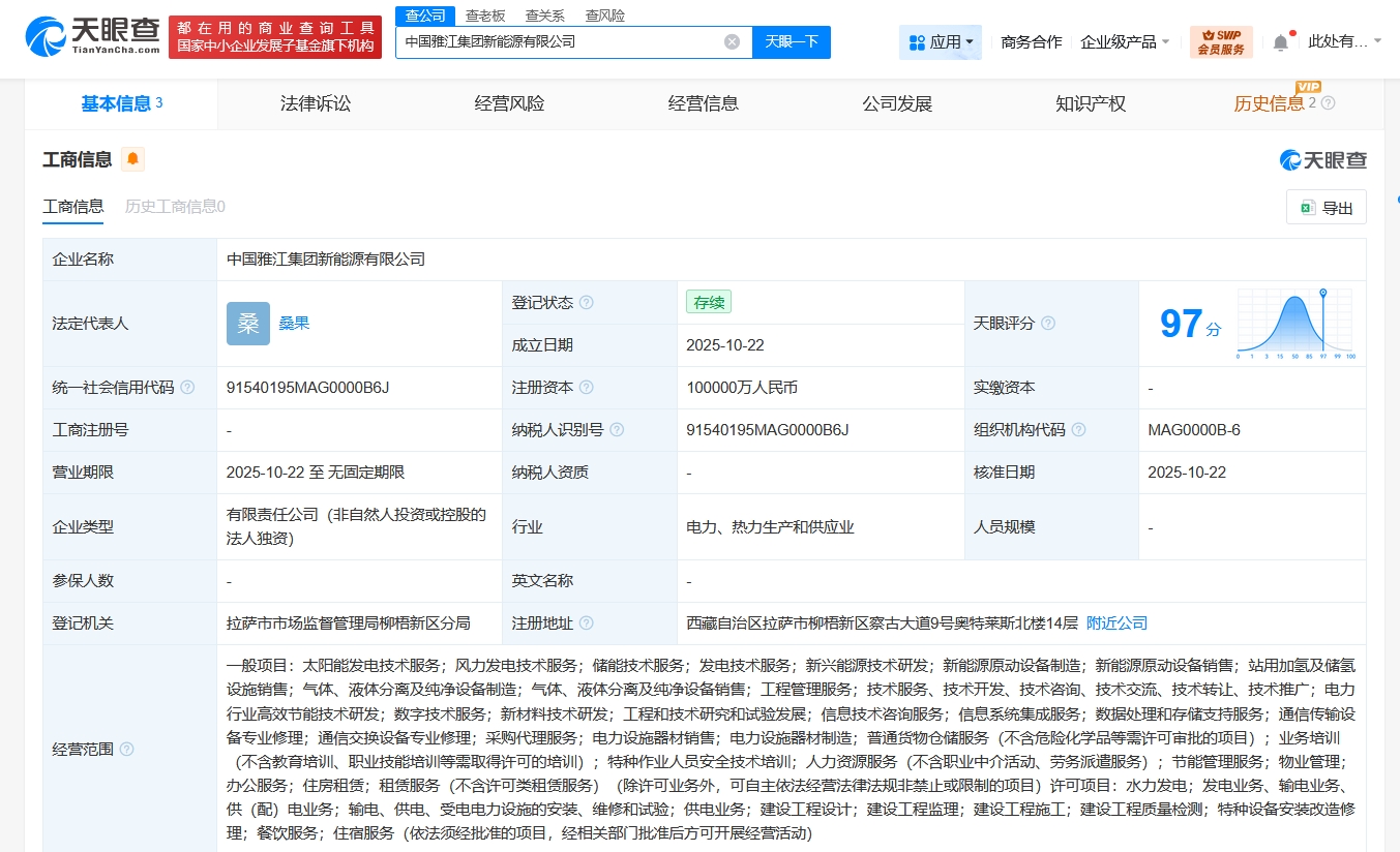 天眼查app显示,近日,中国雅江集团新能源有限公司成立,法定代表人为桑果,注册资本10亿人民币,经营范围含太阳能发电技术服务、风力发电技术服务、储能技术服务、发电技术服务、新兴能源技术研发、新能源原动设备制造、新能源原动设备销售、站用加氢及储氢设施销售、信息系统集成服务、数据处理和存储支持服务等。股东信息显示,该公司由中国雅江集团有限公司全资持股。