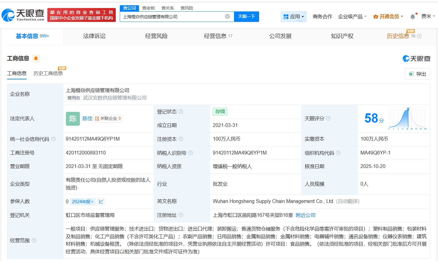 天眼查app显示,近日,武汉宏胜供应链管理有限公司发生工商变更,企业名称变更为上海橙焱供应链管理有限公司。