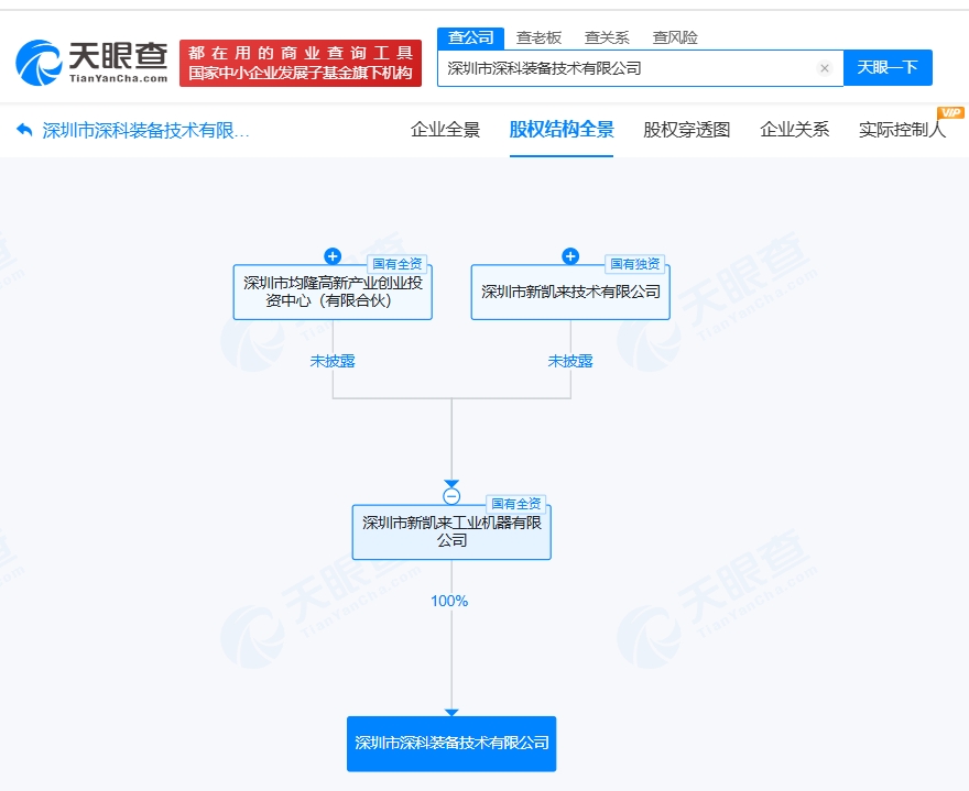 深圳市深科装备技术有限公司成立于2022年2月,注册资本约15亿人民币,经营范围包括智能基础制造装备销售、半导体器件专用设备销售、电子专用设备销售等。股权全景穿透图显示,该公司由新凯来旗下深圳市新凯来工业机器有限公司全资持股。