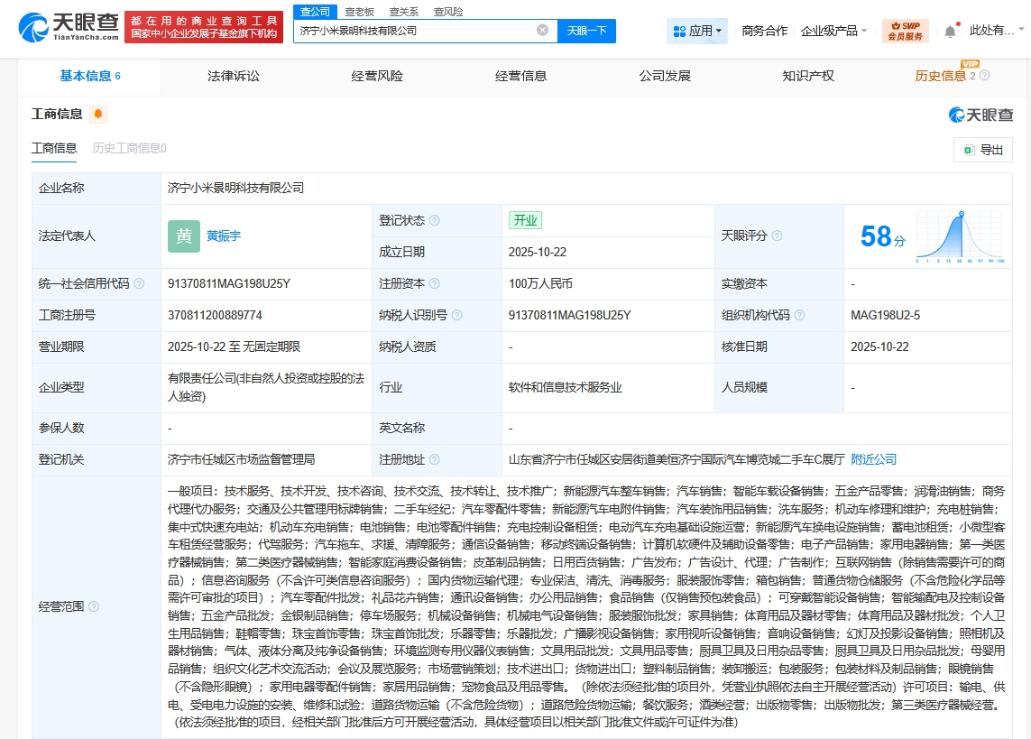 天眼查工商信息显示,近日,济宁小米景明科技有限公司成立,法定代表人为黄振宇,注册资本100万人民币,经营范围含新能源汽车整车销售、汽车销售、智能车载设备销售、五金产品零售、润滑油销售、商务代理代办服务、二手车经纪、汽车零配件零售、新能源汽车电附件销售、充电桩销售等。股东信息显示,该公司由小米景明科技有限公司全资持股。
