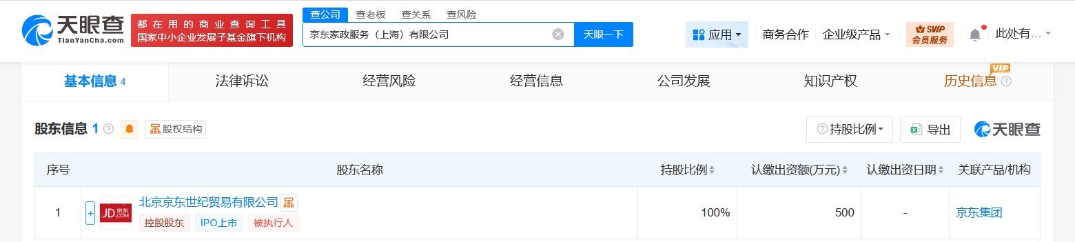 天眼查工商信息显示,近日,京东家政服务(上海)有限公司成立,法定代表人为郭兴伟,注册资本500万人民币,经营范围含家政服务、信息技术咨询服务、市场营销策划、普通货物仓储服务、包装材料及制品销售、服装服饰零售、家用电器销售、人力资源服务、企业管理咨询等。股东信息显示,该公司由北京京东世纪贸易有限公司全资持股。