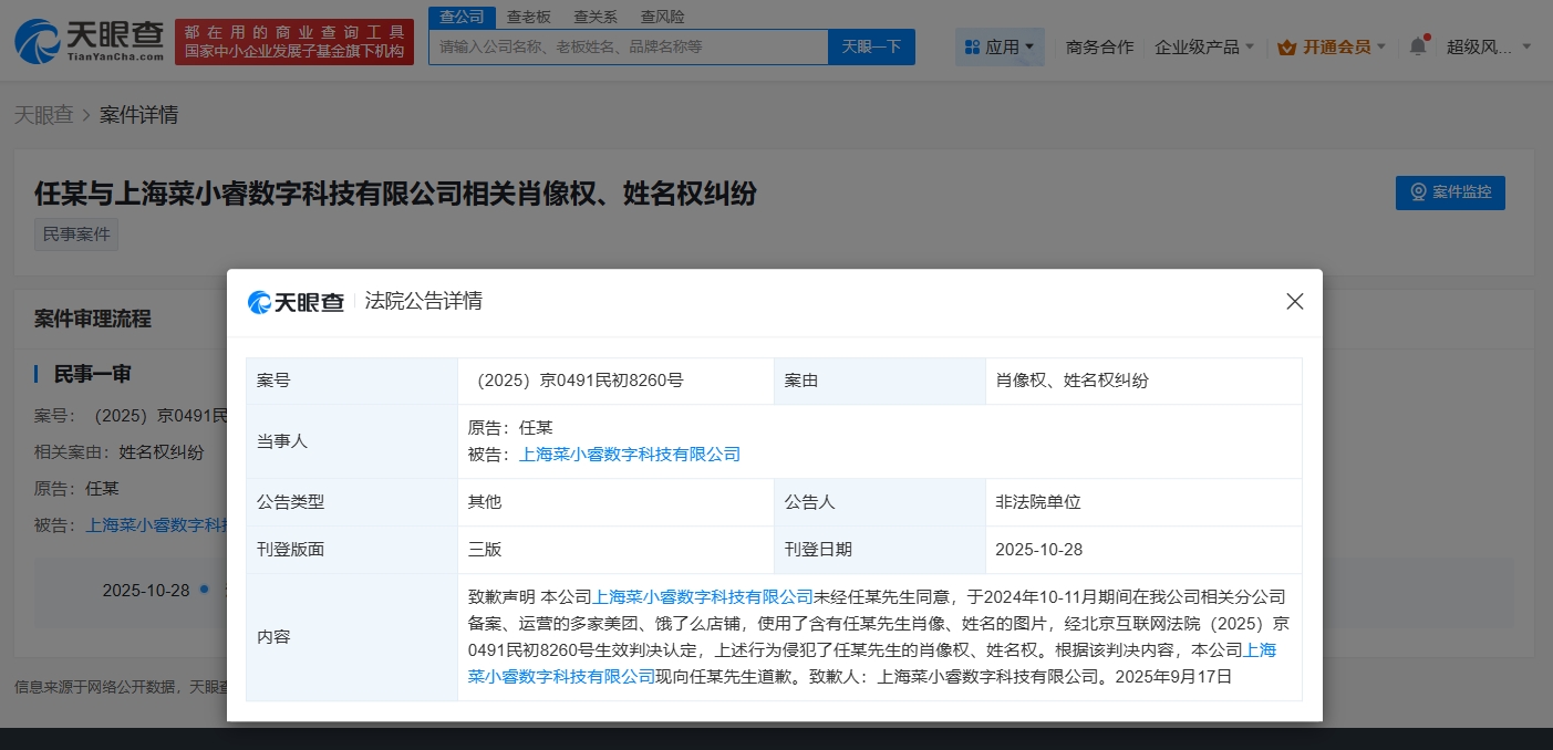 天眼查天眼风险信息显示,10月28日,法院刊登上海菜小睿数字科技有限公司向任国超(任嘉伦)致歉的声明。公告显示,该公司未经任国超先生同意,于2024年10-11月期间在其相关分公司备案、运营的多家美团、饿了么店铺,使用了含有任国超先生肖像、姓名的图片,对此向任国超先生道歉。