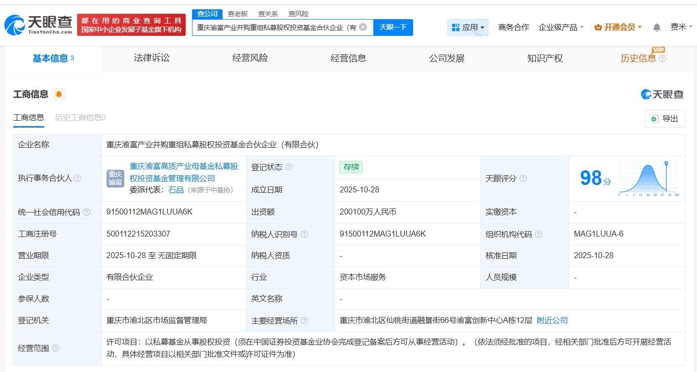 天眼查app显示,近日,重庆渝富产业并购重组私募股权投资基金合伙企业(有限合伙)成立,执行事务合伙人为重庆渝富高质产业母基金私募股权投资基金管理有限公司,出资额20.01亿人民币,经营范围为以私募基金从事股权投资,由重庆产业投资母基金合伙企业(有限合伙)、重庆渝富高质产业母基金私募股权投资基金管理有限公司共同出资。