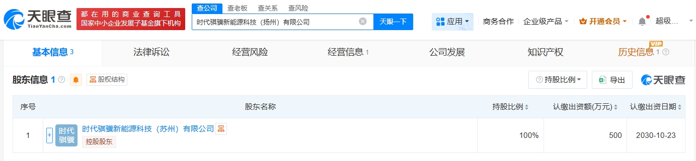 天眼查app显示,近日,时代骐骥新能源科技(扬州)有限公司成立,法定代表人为宋庆龙,注册资本500万人民币,经营范围包括新兴能源技术研发、新能源汽车换电设施销售、合同能源管理、电池销售等。股东信息显示,该公司由宁德时代旗下时代骐骥新能源科技(苏州)有限公司全资持股。