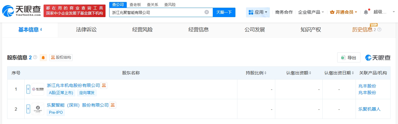 天眼查工商信息显示,近日,浙江兆聚智能有限公司成立,法定代表人为孔辰寰,注册资本1000万人民币,经营范围包括工业机器人制造、人工智能应用软件开发、大数据服务、数据处理服务、互联网数据服务等。股东信息显示,该公司由兆丰股份(300695)、乐聚智能(深圳)股份有限公司共同持股。
