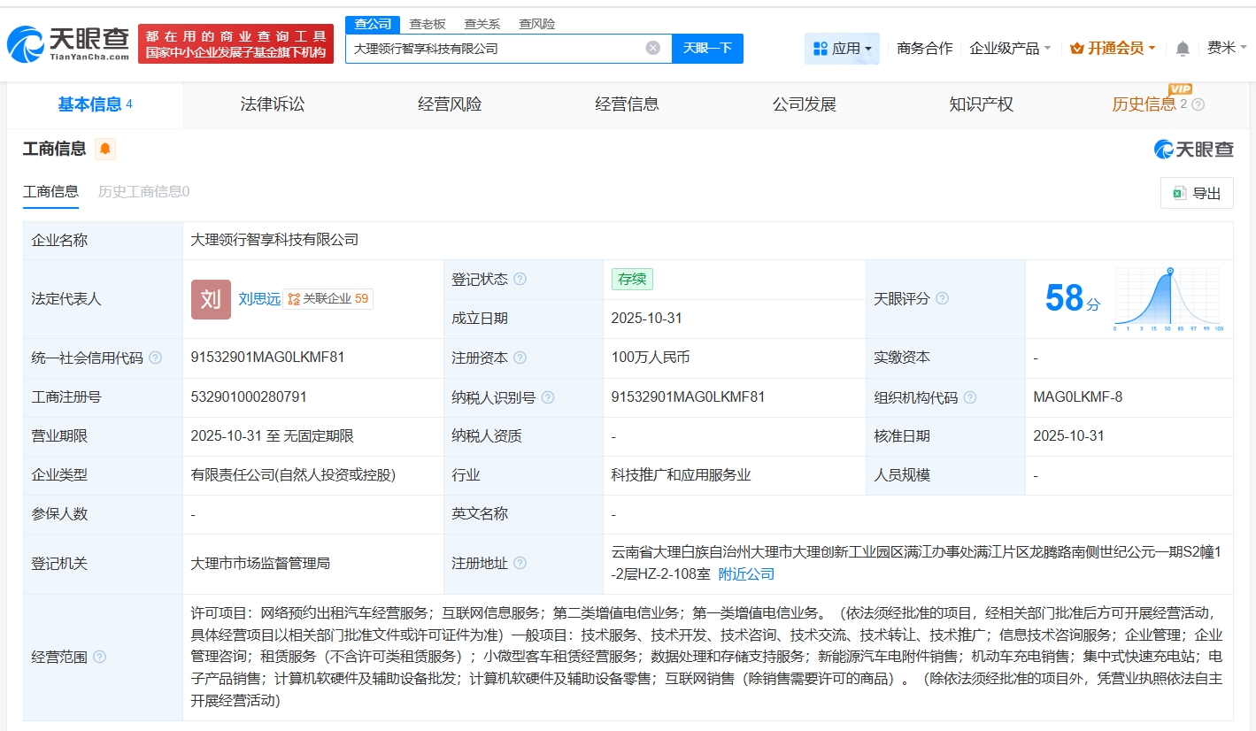天眼查工商信息显示,近日,大理领行智享科技有限公司成立,法定代表人为刘思远,注册资本100万人民币,经营范围包括网络预约出租汽车经营服务、互联网信息服务、第二类增值电信业务等。股东信息显示,该公司由t3出行关联公司南京领行科技股份有限公司全资持股。