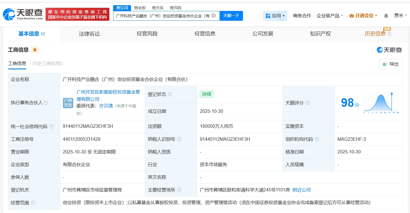天眼查工商信息显示,近日,广开科技产业融合(广州)创业投资基金合伙企业(有限合伙)成立,执行事务合伙人为广州开发区新星股权投资基金管理有限公司,出资额18亿人民币,经营范围为创业投资,以私募基金从事股权投资、投资管理、资产管理等活动。合伙人信息显示,该基金由广州国聚创业投资有限公司、广州凯得云科运营管理有限公司、广州黄埔开投产业投资基金合伙企业(有限合伙)等共同出资。