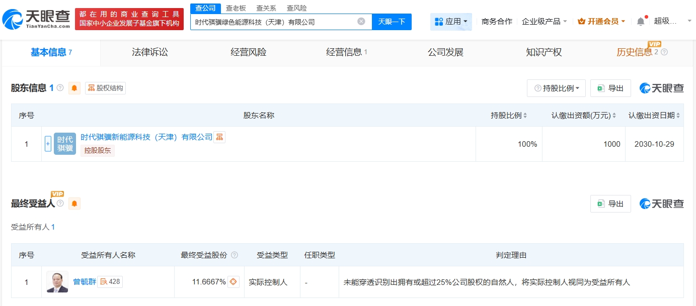 天眼查app显示,近日,时代骐骥绿色能源科技(天津)有限公司成立,法定代表人为宋辉,注册资本1000万人民币,经营范围包括新兴能源技术研发、新能源汽车换电设施销售、在线能源计量技术研发、合同能源管理等。股东信息显示,该公司由宁德时代旗下时代骐骥新能源科技(天津)有限公司全资持股。