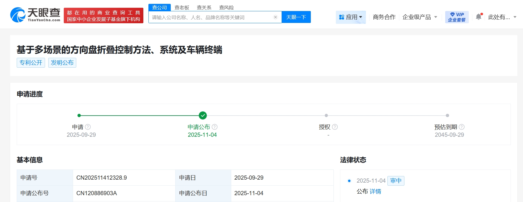 天眼查app显示,11月4日,赛力斯汽车有限公司申请的“基于多场景的方向盘折叠控制方法、系统及车辆终端”专利公布。