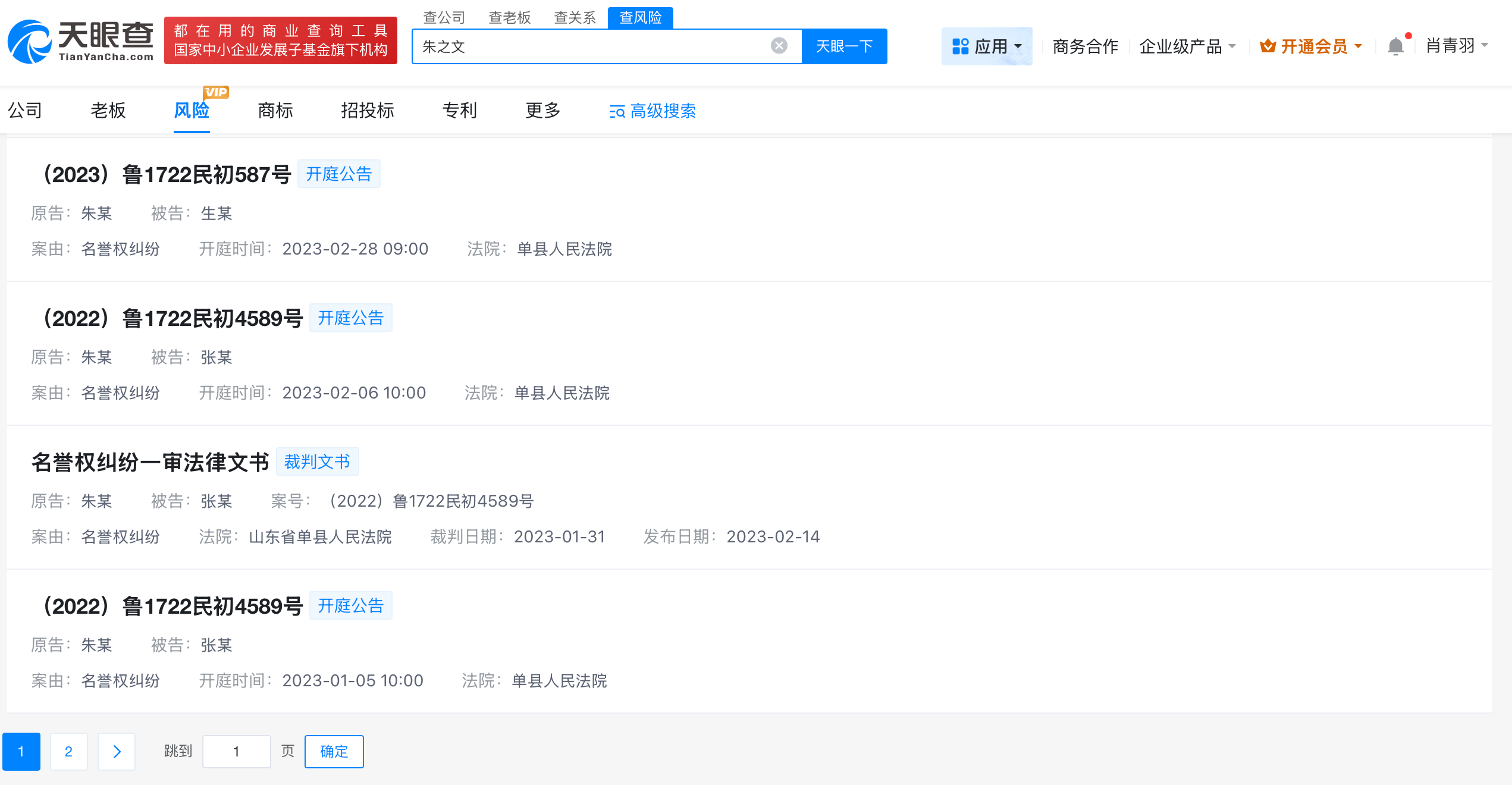 天眼查天眼风险信息显示,此前,朱之文曾多次发起维权诉讼,被告分别为生某、张某等,案由涉及名誉权纠纷,上述案件已于2022年、2023年开庭审理。