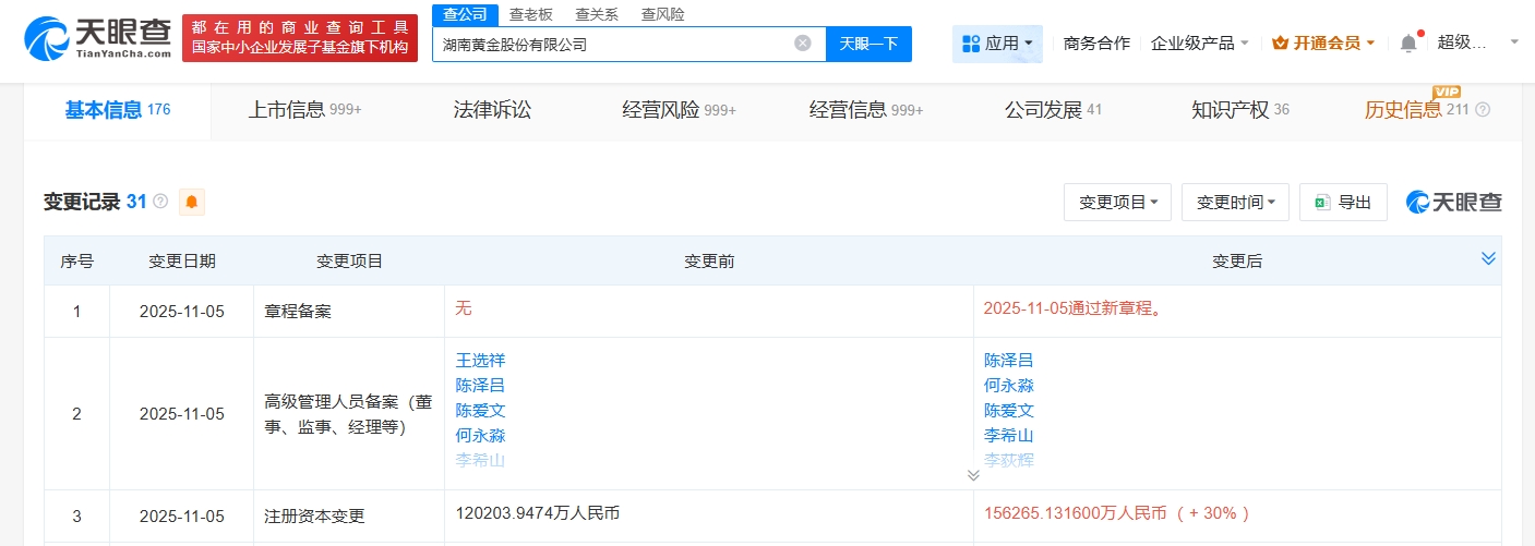 天眼查app显示,近日,湖南黄金(002155)发生工商变更,注册资本由约12.02亿人民币增至约15.63亿人民币,增幅30%。