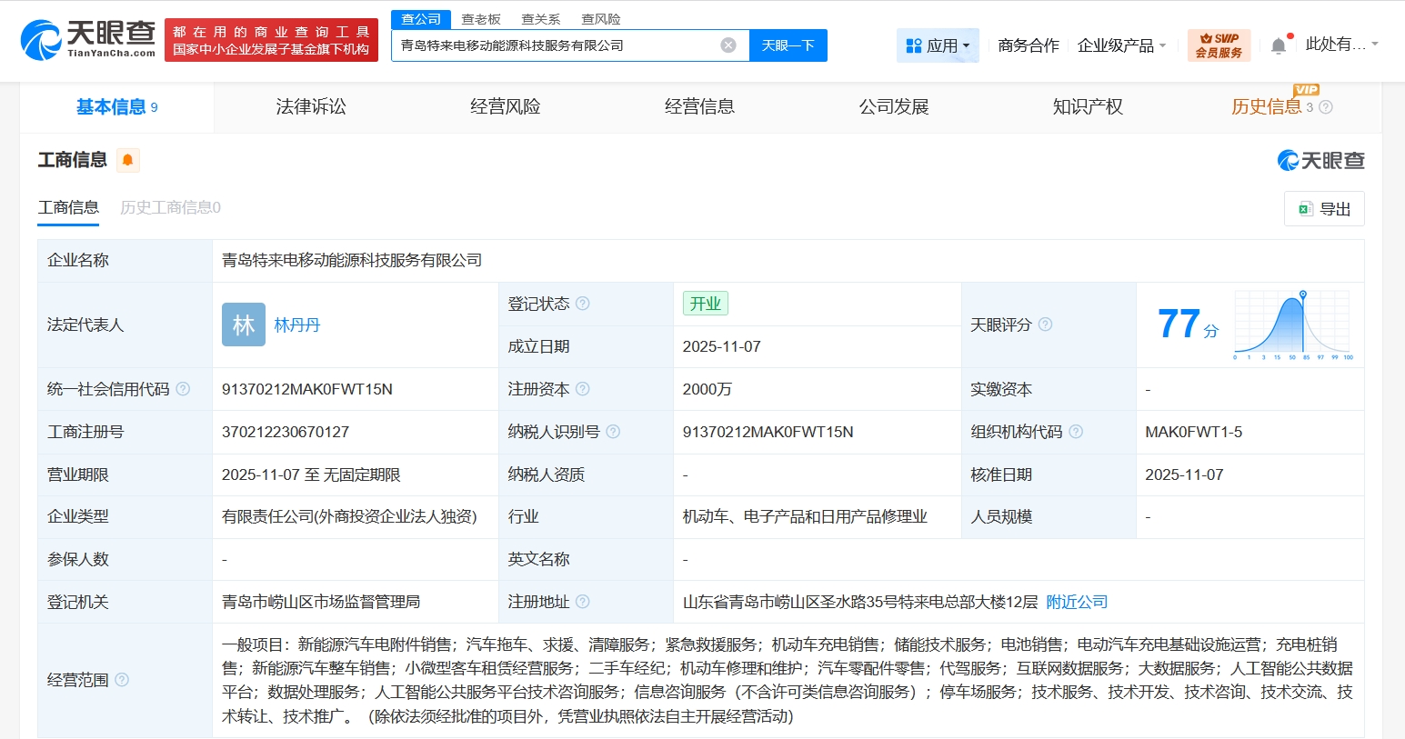 天眼查工商信息显示,近日,青岛特来电移动能源科技服务有限公司成立,法定代表人为林丹丹,注册资本2000万人民币,经营范围含新能源汽车电附件销售,汽车拖车、求援、清障服务,紧急救援服务,储能技术服务,电池销售,电动汽车充电基础设施运营,新能源汽车整车销售,二手车经纪,人工智能公共数据平台,数据处理服务等。股东信息显示,该公司由特来电新能源股份有限公司全资持股。