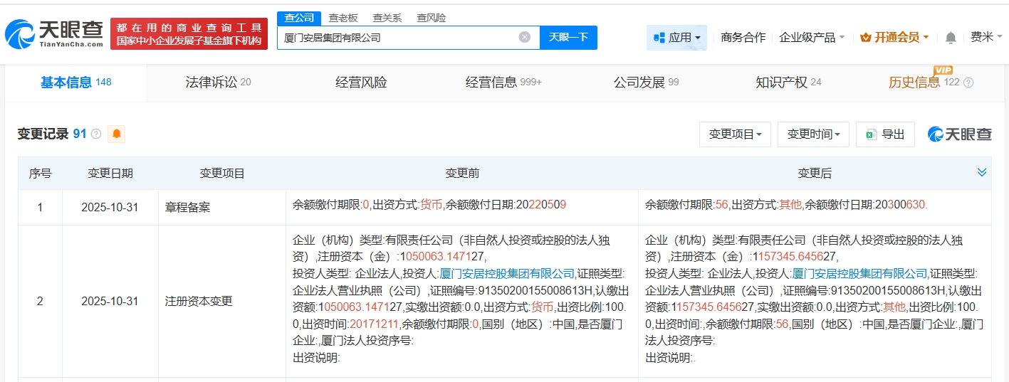 天眼查工商信息显示,近日,厦门安居集团有限公司发生工商变更,注册资本由约105亿人民币增至约115.7亿人民币。
