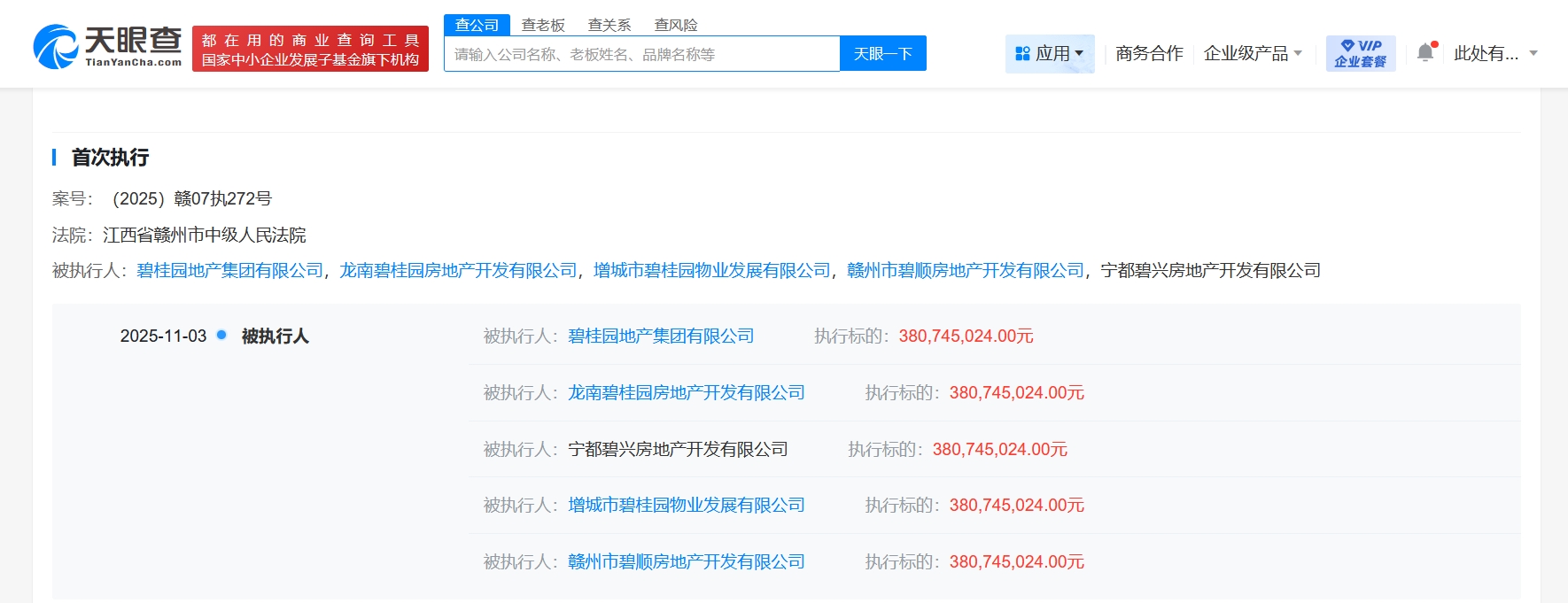天眼查app显示,近日,碧桂园地产集团有限公司新增3条被执行人信息,执行标的合计3.8亿余元,被执行人还包括龙南碧桂园房地产开发有限公司、增城市碧桂园物业发展有限公司等,执行法院为江西省赣州市中级人民法院、山东省济南市中级人民法院。
