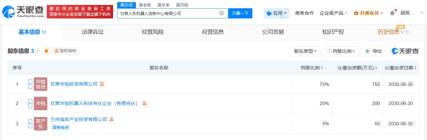 天眼查app显示,近日,甘肃人形机器人创新中心有限公司成立,法定代表人为贾乐,注册资本1000万人民币,经营范围包括工业自动控制系统装置制造、智能机器人的研发、智能机器人销售等。股东信息显示,该公司由甘肃华悦投资有限公司、甘肃华悦机器人科技合伙企业(有限合伙)、兰州城发产业投资有限公司共同持股。
