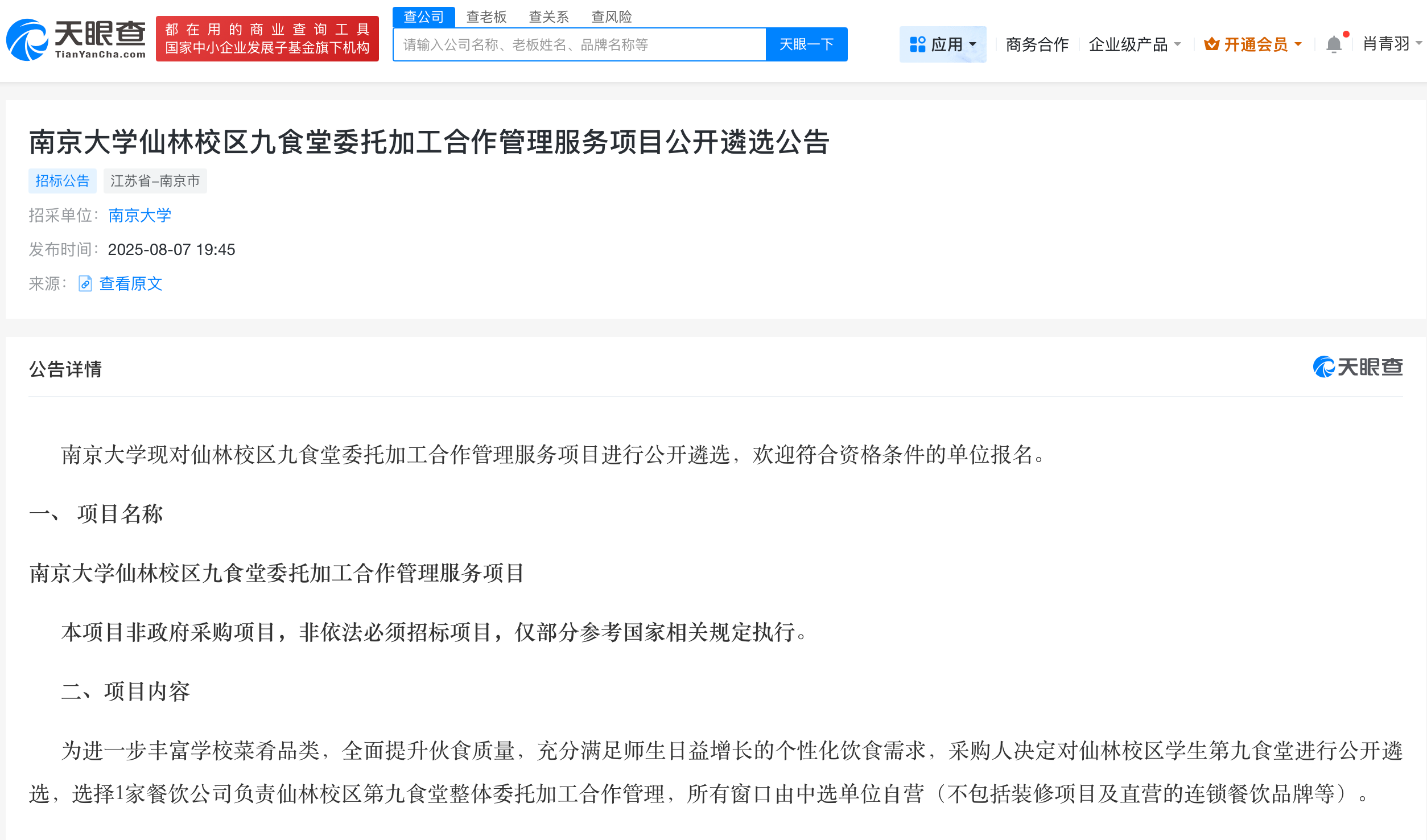 天眼查app显示,南京大学曾于今年8月发布仙林校区九食堂委托加工合作管理服务项目公开遴选公告,称为进一步丰富学校菜肴品类,全面提升伙食质量,充分满足师生日益增长的个性化饮食需求,采购人决定对仙林校区学生第九食堂进行公开遴选,选择1家餐饮公司负责仙林校区第九食堂整体委托加工合作管理,所有窗口由中选单位自营(不包括装修项目及直营的连锁餐饮品牌等)。