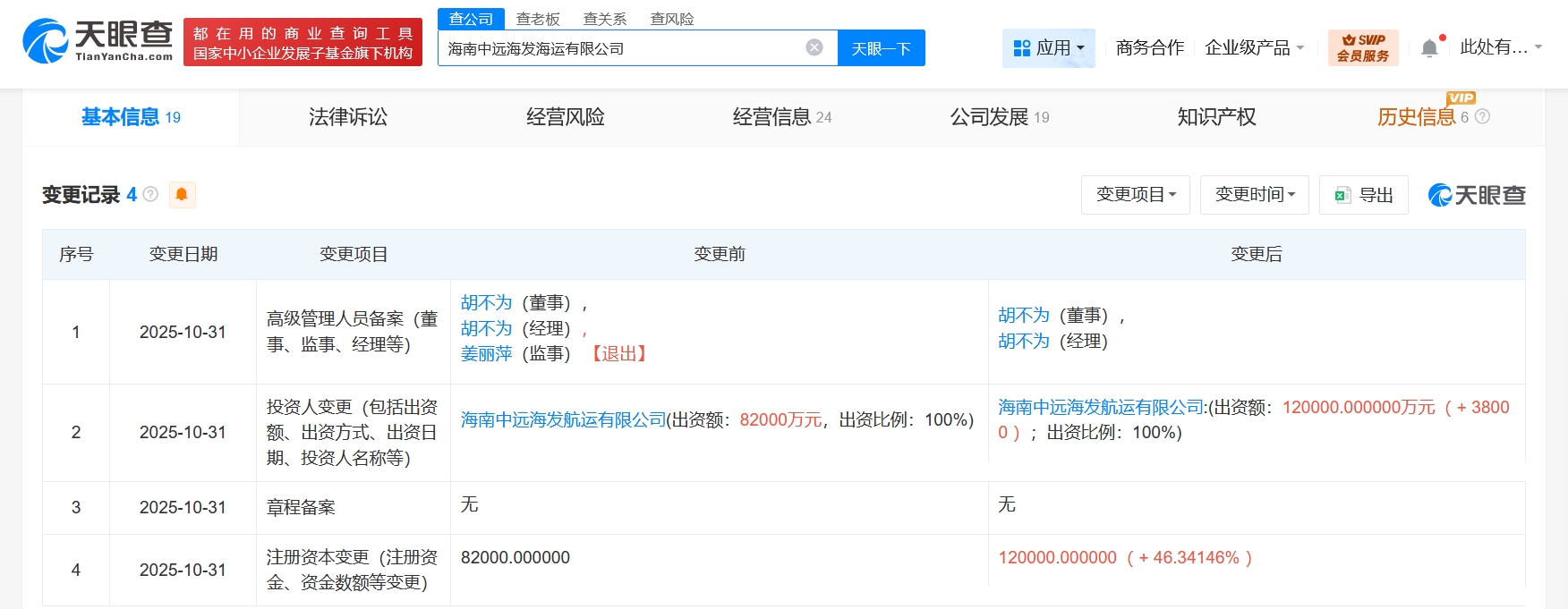 天眼查工商信息显示,近日,海南中远海发海运有限公司发生工商变更,注册资本由8.2亿人民币增至12亿人民币,增幅约46%,同时,姜丽萍卸任监事职务。