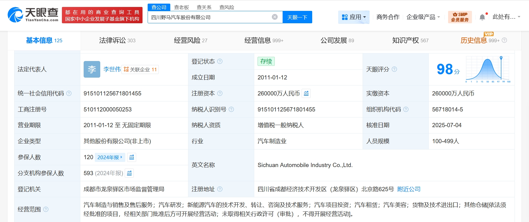 天眼查app显示,近日,四川野马汽车股份有限公司因通过登记的住所或者经营场所无法联系,被成都市龙泉驿区市场监督管理局列入经营异常名录。