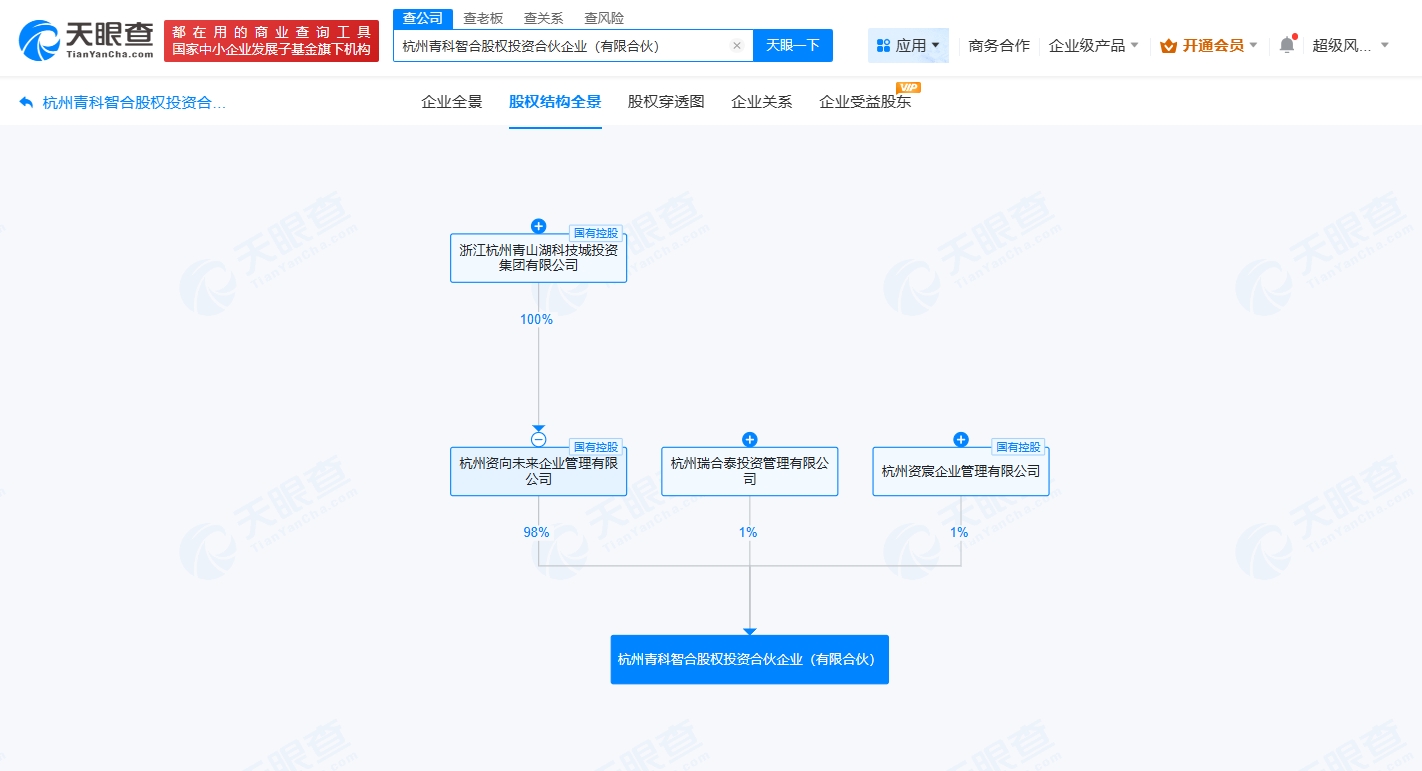 天眼查app显示,近日,杭州青科智合股权投资合伙企业(有限合伙)成立,执行事务合伙人为杭州资宸企业管理有限公司、杭州瑞合泰投资管理有限公司,出资额50亿人民币,经营范围为以私募基金从事股权投资、投资管理、资产管理等活动。合伙人信息显示,该合伙企业由浙江杭州青山湖科技城投资集团有限公司旗下杭州资向未来企业管理有限公司以及杭州瑞合泰投资管理有限公司、杭州资宸企业管理有限公司共同出资。