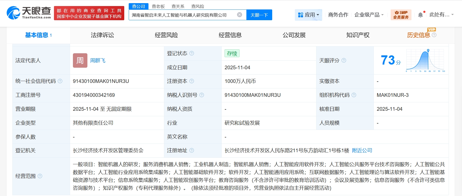 天眼查工商信息显示,近日,湖南省智启未来人工智能与机器人研究院有限公司成立,法定代表人为周群飞,注册资本1000万人民币,经营范围含智能机器人的研发、服务消费机器人销售、工业机器人制造、智能机器人销售、人工智能应用软件开发、人工智能公共服务平台技术咨询服务、人工智能公共数据平台、人工智能行业应用系统集成服务等。股东信息显示,该公司由蓝思科技(300433)、万鑫精工(湖南)股份有限公司、长沙麦睛科技股份有限公司等共同持股。