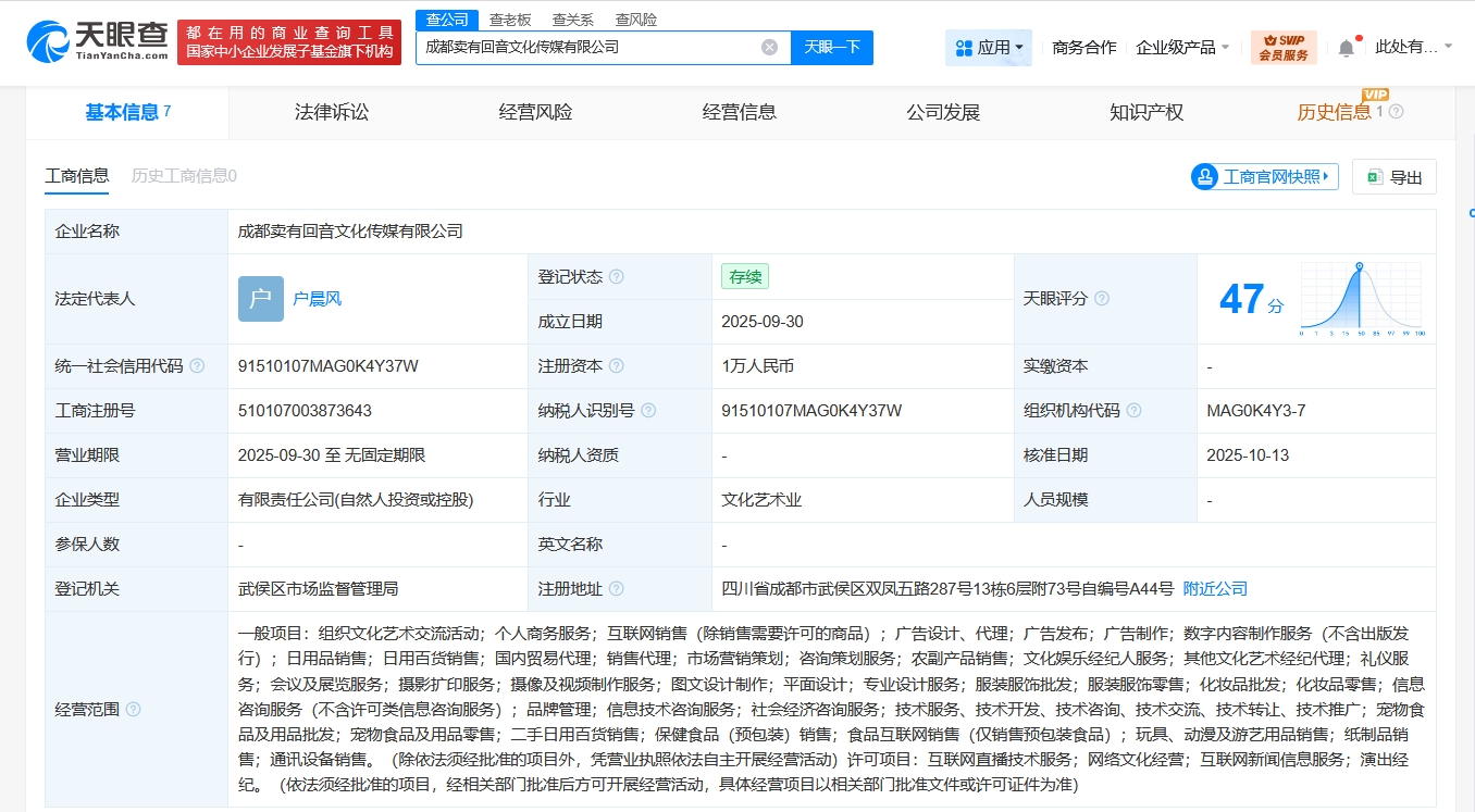 天眼查app显示,今年9月30日,成都卖有回音文化传媒有限公司成立,法定代表人、董事、经理为户晨风,注册资本1万人民币,经营范围含组织文化艺术交流活动,个人商务服务,互联网销售,广告设计、代理,数字内容制作服务,日用百货销售,国内贸易代理,信息技术咨询服务,互联网直播技术服务等。股东信息显示,该公司由户晨风、李利梅分别持股95%、5%。