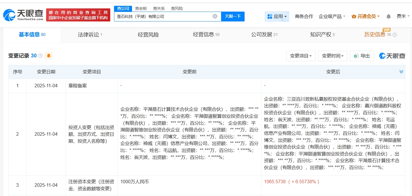 天眼查工商信息显示,近日,是石科技(平湖)有限公司发生工商变更,新增百度旗下三亚百川致新私募股权投资基金合伙企业(有限合伙)、嘉兴御道数科股权投资合伙企业(有限合伙)为股东,同时,注册资本由1000万人民币增至约1065.6万人民币。