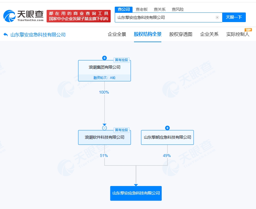 天眼查app显示,近日,山东擎安应急科技有限公司成立,法定代表人为李蒙,注册资本500万人民币,经营范围包括人工智能应用软件开发、安全咨询服务、信息系统集成服务等。股权全景穿透图显示,该公司由浪潮集团旗下浪潮软件科技有限公司、山东擎朗应急科技有限公司共同持股。