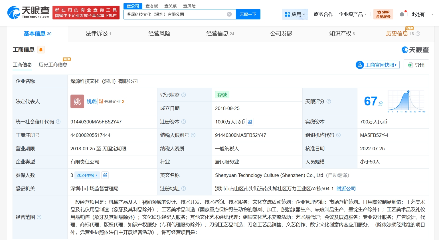 深源科技文化(深圳)有限公司成立于2018年9月,法定代表人为姚璐,注册资本1000万人民币,经营范围含机械产品及人工智能领域的设计、技术开发、技术咨询、技术服务,文化交流活动策划,企业管理咨询,市场营销策划等。